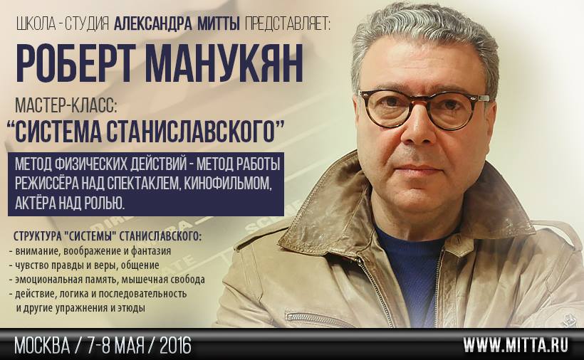 7-8 мая киношкола А.Митты представляет мастер-класс Роберта Манукяна – «СИСТЕМА СТАНИСЛАВСКОГО - МЕТОД РАБОТЫ РЕЖИССЁРА НАД СПЕКТАКЛЕМ И АКТЁРА НАД РОЛЬЮ»